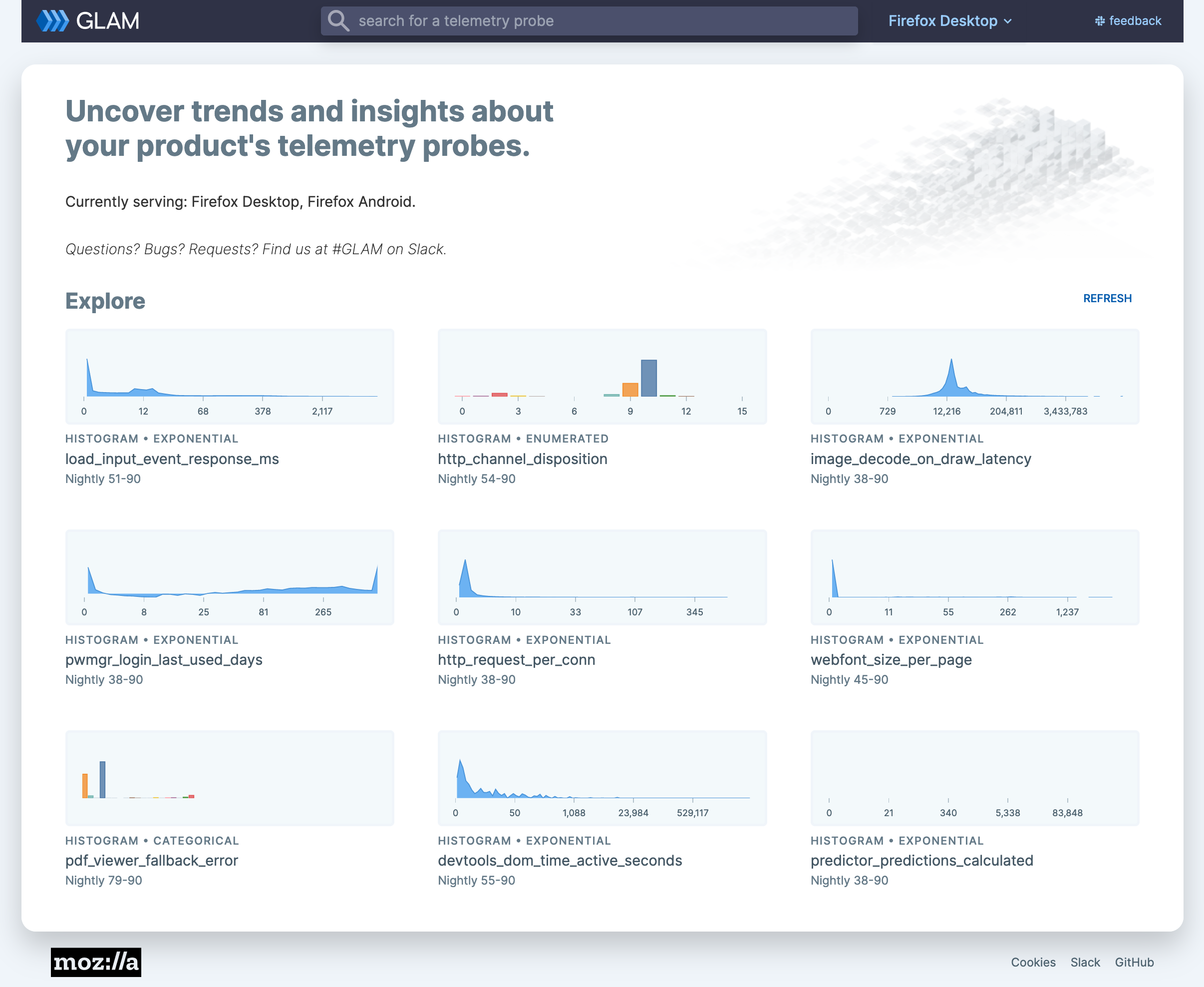 The Glean Aggregated Metrics Dashboard (GLAM) is an interactive dashboard that is Mozilla’s primary self-service tool for examining the distributions of values of specific individual telemetry metrics, over time and across different user populations. It is similar to GUD in that it is meant to be usable by everyone; no specific data analysis or coding skills are needed. But while GUD is focused on a relatively small number of high level, derived product metrics about user engagement (e.g. MAU, DAU, retention, etc) GLAM is focused on a diverse and plentiful set of probes and data points that engineers capture in code and transmit back from Firefox and other Mozilla products.